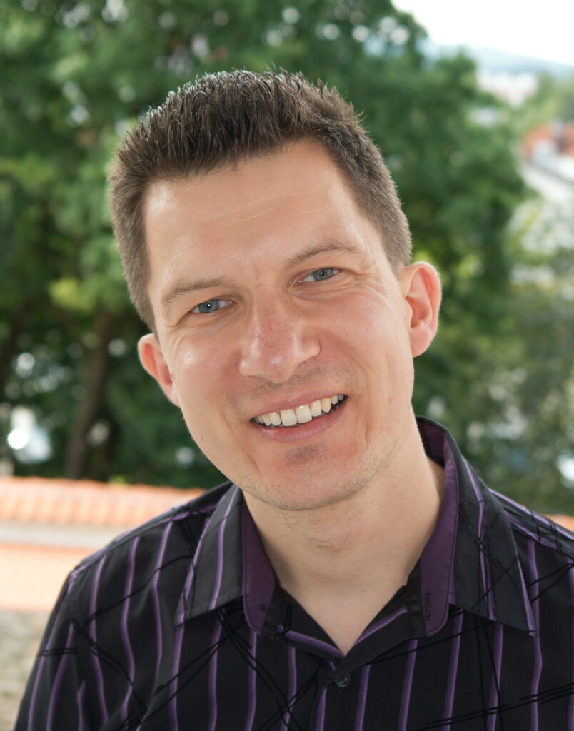 Mann lächelt im Freien mit Bäumen im Hintergrund.
