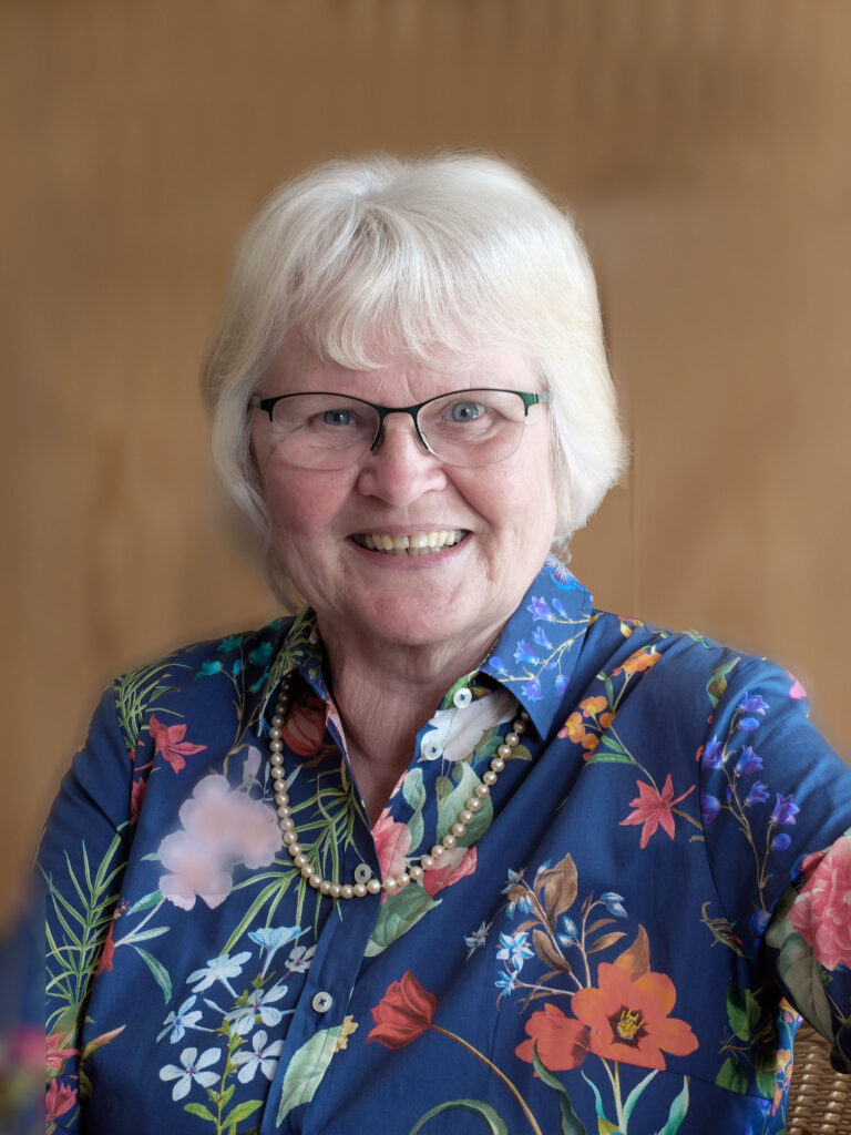 Ältere Frau mit Brille und Blumenhemd lächelnd