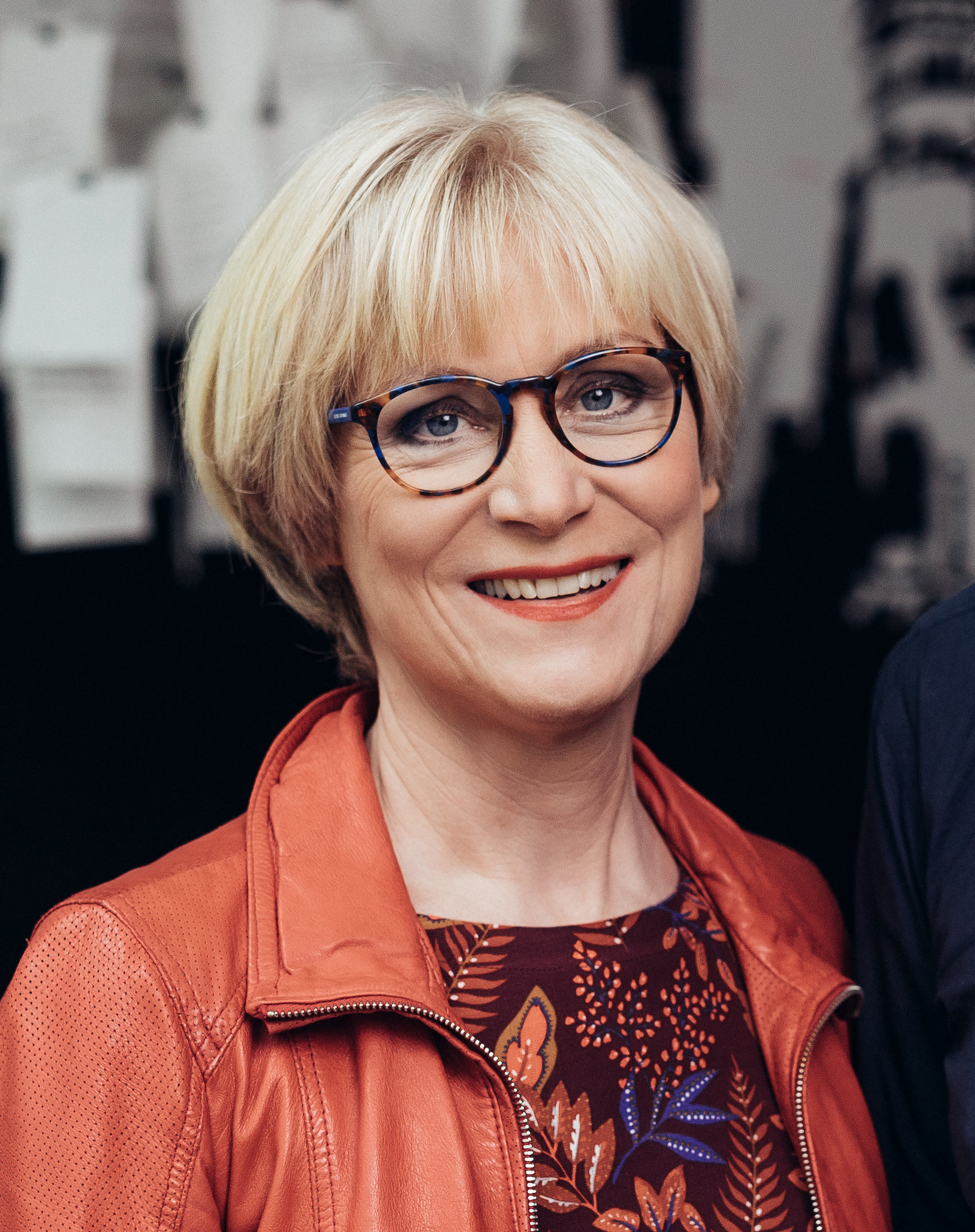 Das Bild zeigt das Wort hier in einer lässigen, orangefarbenen Schriftart auf weißem Hintergrund.
